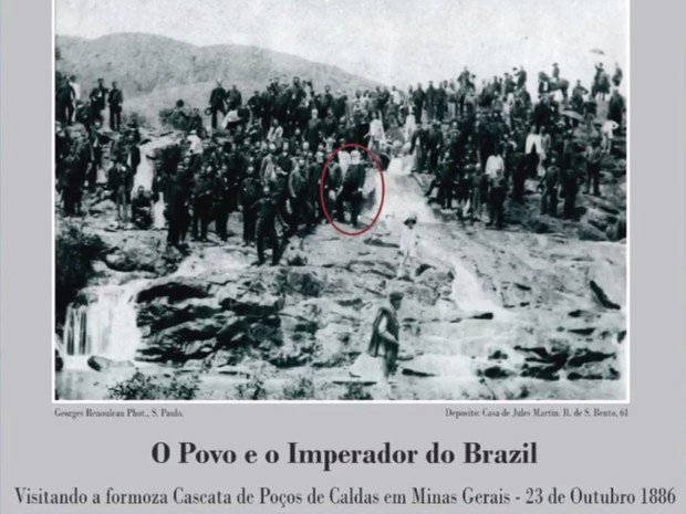 A foto acima é da época e publicada muitas vezes em importantes livros como sendo em Poços de Caldas mas na verdade é em Petrópolis. Como foto na época era coisa complicada de se fazer a assessoria trouxe e distribuiu fotos já reveladas e ficou o erro de ser em Poços de caldas. A única foto de D. Pedro II em Poços foi tirada na cachoeira da cascatinha mas é de pouca qualidade e quase não se identifica ninguém. Talvez o Imperador e o Padre Victor, de Três Pontas que estava em tratamento na cidade e foi também receber D. Pedro.