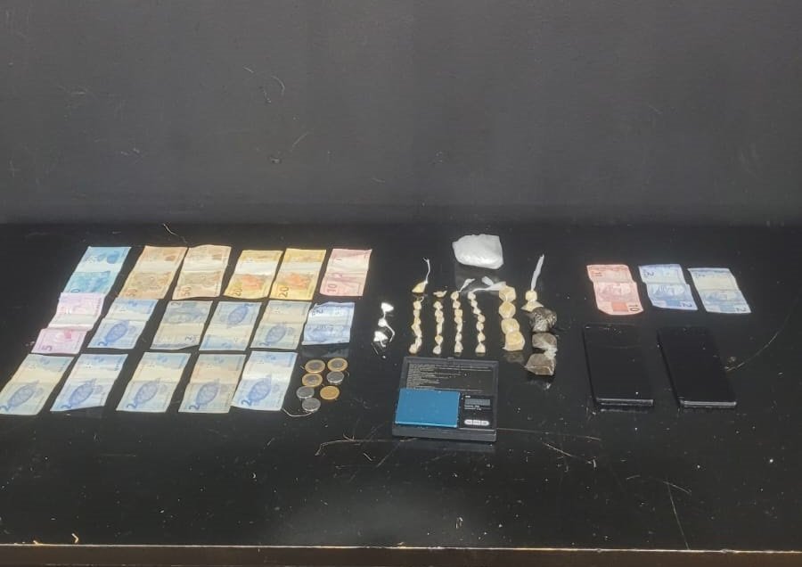 Dando continuidade às diligências, os policiais localizaram e apreenderam diversas porções de crack, cocaína, maconha e haxixe, além de dinheiro, celulares, material para embalar drogas e uma balança.