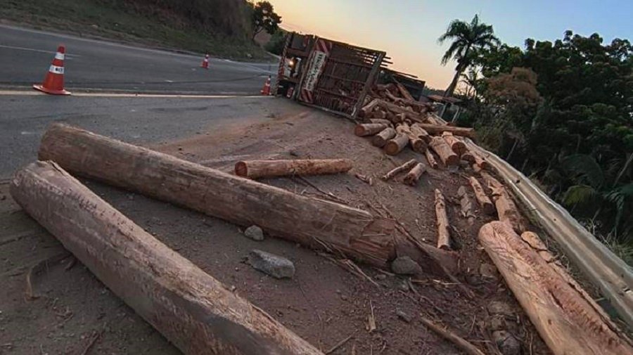 Uma carreta carregada com toras de madeira tombou na tarde deste domingo, 5, na BR-459, em Congonhal-MG. Parte da carga se espalhou pela rodovia , na região do KM97.