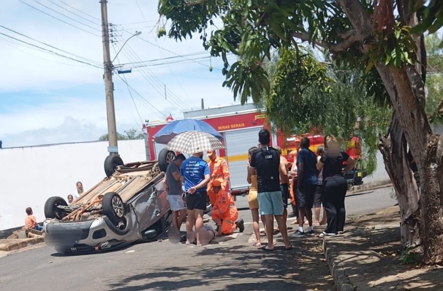 Carro capota após batida em cruzamento e deixa duas feridas em Alfenas