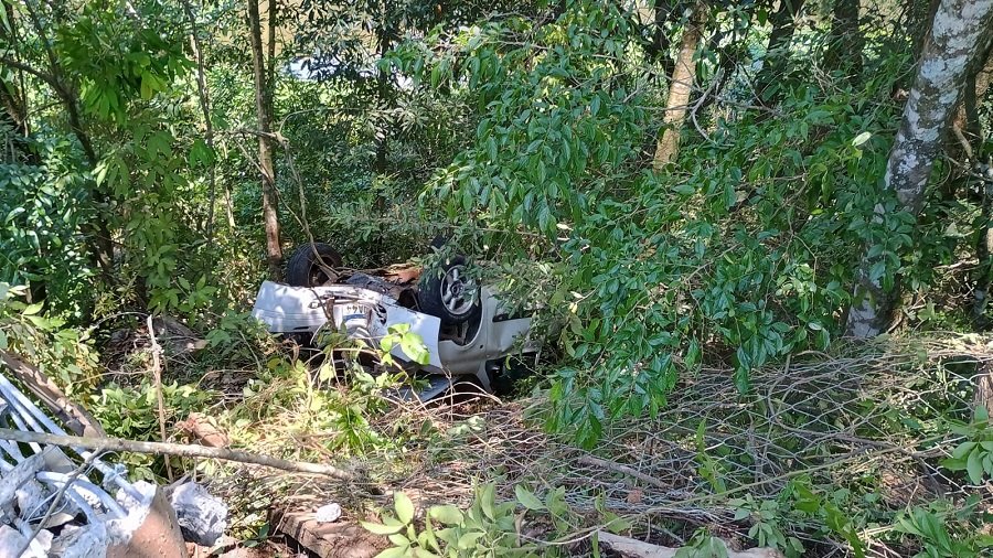 O motorista contou aos policiais que seguida do Bairro Bortolan e ao acessar o Véu das Noivas perdeu o controle da direção, bateu no poste de energia elétrica e depois caiu na ribanceira, próximo ao ribeirão que segue para a Cascata Véu das Noivas, ficando com as rodas para cima.