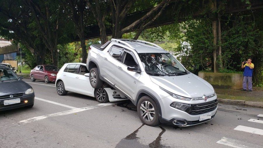 Uma caminhonete teria parado no sinal vermelho em frente à padaria Pão Pão e um carro que vinha atrás não conseguiu parar a tempo e enfiou debaixo da caminhonete. Apesar do susto e danos materiais ninguém ficou ferido.