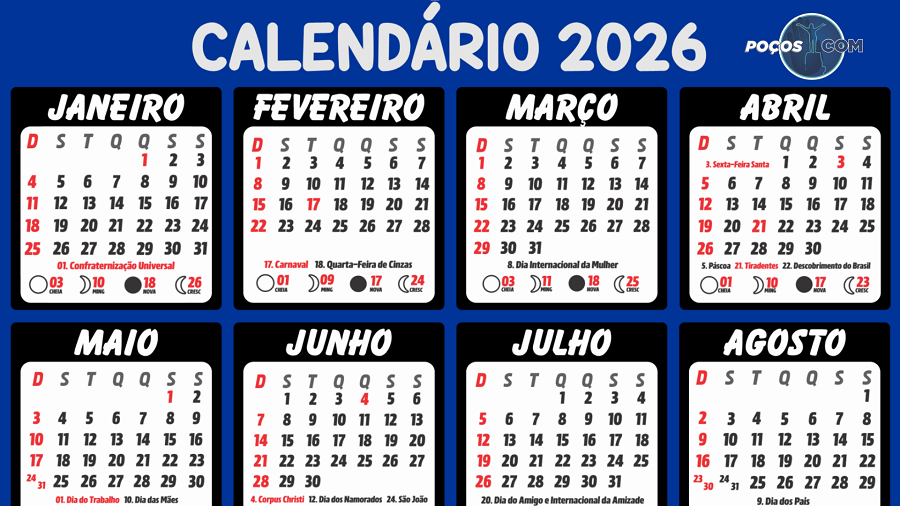 Confira o calendário de feriados nacionais e pontos facultativos em 2026:
