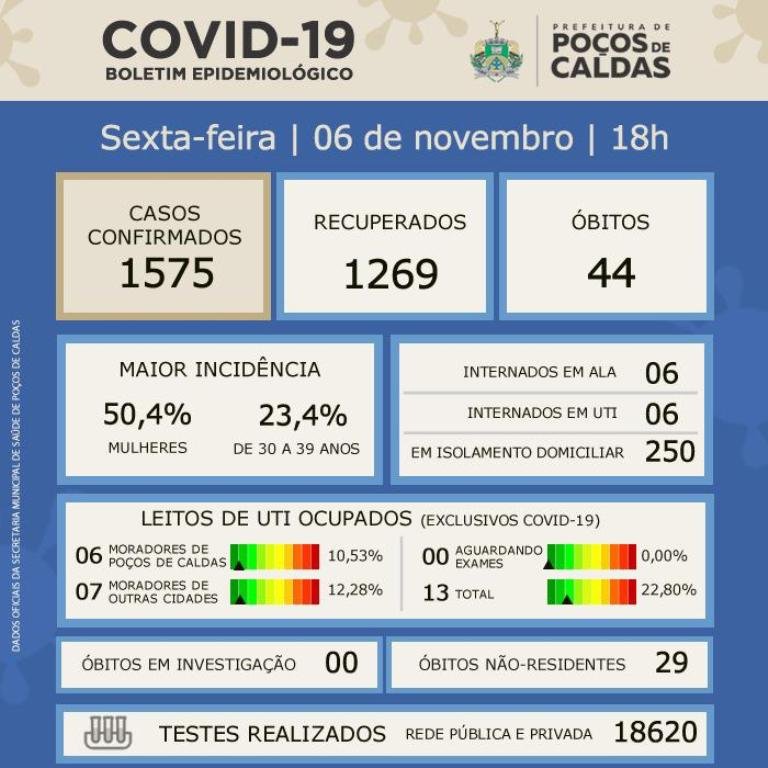 Dentre os 1.575 casos positivos no município, 50,4% se referem a pacientes do sexo feminino. A faixa etária de maior incidência é dos 30 aos 39 anos, que corresponde a 23,4% dos casos. A taxa de ocupação de Unidade de Terapia Intensiva, nesta sexta, está em 22,80%. São 13 leitos ocupados, sendo seis por pacientes confirmados e residentes em Poços, o que corresponde a 10,53%. Sete leitos ocupados por pacientes residentes em outros municípios, o que corresponde a 12,28% da ocupação.