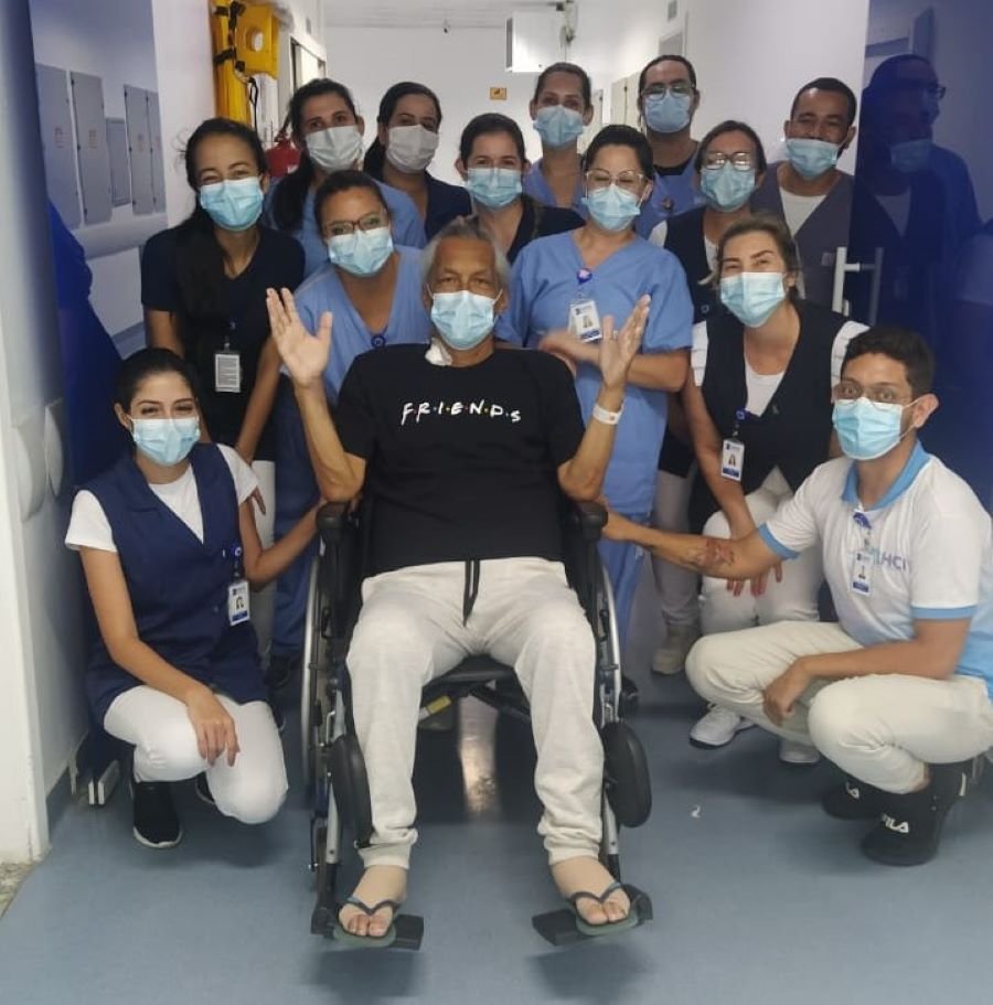 Na despedida, a equipe de enfermeiros e enfermeiras comemoram a alta e boa recuperação do artista plástico.