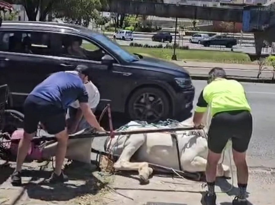 Um vídeo de um cavalo da Associação dos Charretistas de Poços de Caldas sendo socorrido por um dos charretistas e populares na manhã deste domingo, 5, reacendeu a discussão sobre o fim do passeio turístico com tração animal na cidade. As imagens mostram o animal sendo colocado de pé, após ter caído no chão, em frente a um restaurante ao lado da Antiga Estação da Fepasa.
