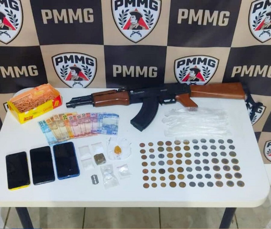 Durante as buscas de cômodo em cômodo, os policias encontraram uma bucha de maconha, três papelotes de cocaína, uma pedra bruta de crack, material para embalar a droga, R$ 251,50 em dinheiro e ainda uma réplica de um fuzil AK 47, além de três celulares.