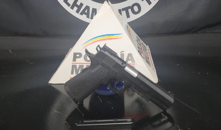 Durante a abordagem, os policiais realizaram uma busca pessoal e localizaram na cintura do suspeito uma arma de airsoft calibre 6mm utilizada no crime.