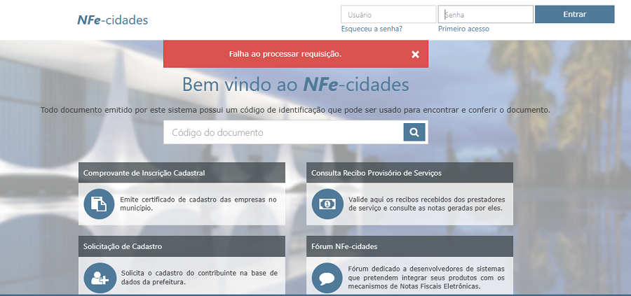 A instabilidade não permite que os contribuintes têm acesso à pagina NFe-Cidades, que disponibiliza o serviço. Ao tentar acessar o login já aparece uma mensagem de falha.