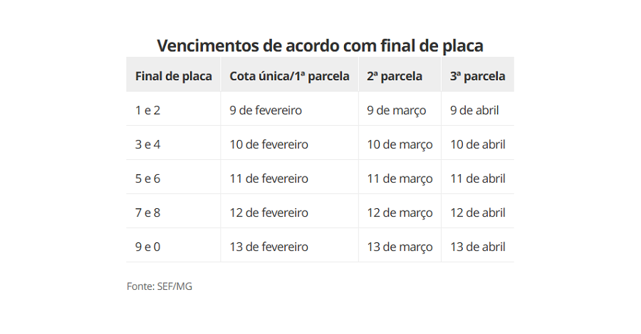 A escala de vencimentos da primeira parcela ou pagamento em cota única do IPVA 2026 vai de 9 a 13 de fevereiro, conforme o final da placa do veículo. A opção pela cota única dá desconto de 3% sobre o valor do imposto.