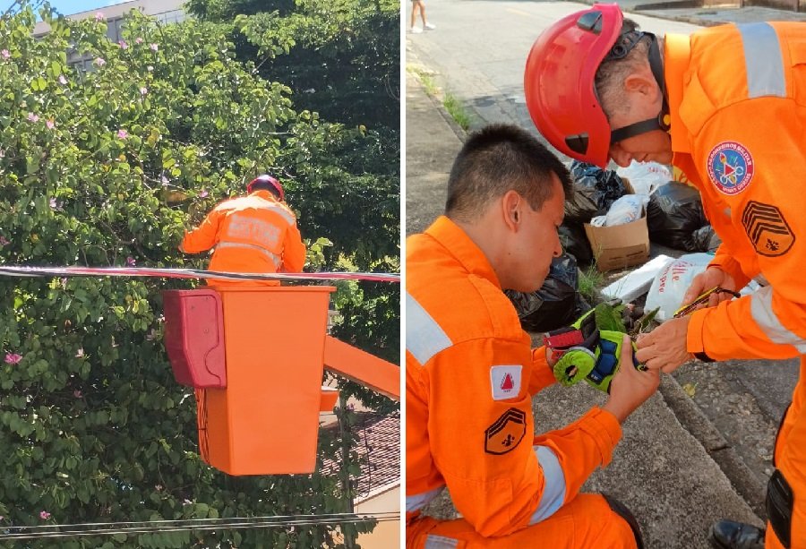 No local, os bombeiros constaram que a maritaca, estava presa por linhas de pipa com cerol, material altamente cortante e frequentemente responsável por acidentes envolvendo pessoas e animais.