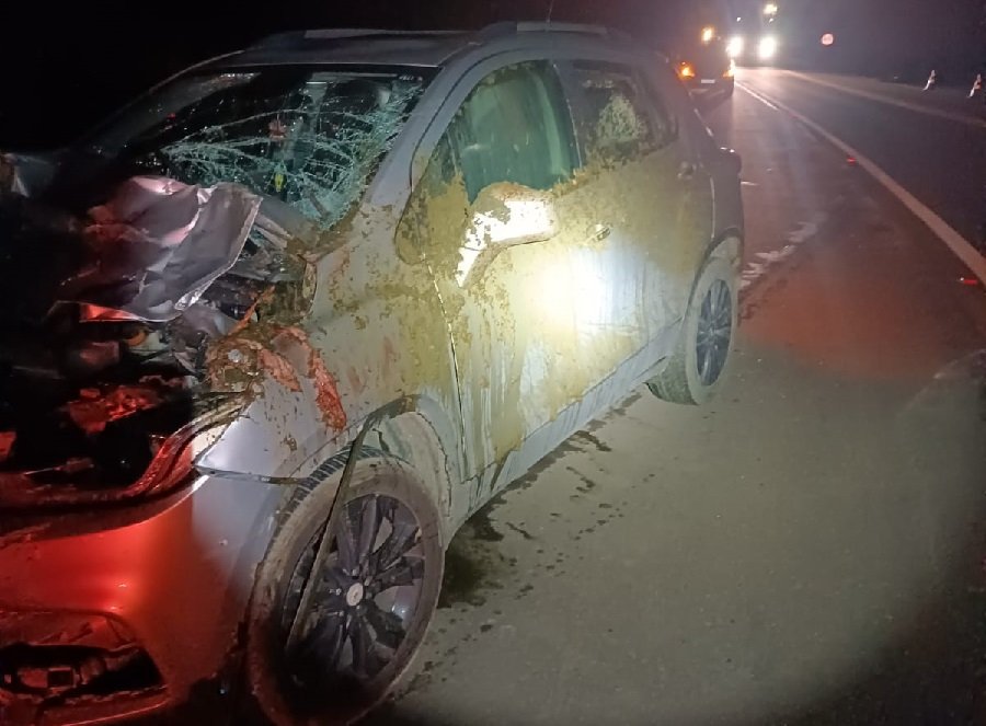 A parte frontal e o para-brisa do veículo ficaram danificados com o impacto e o animal de grande porte não resistiu e morreu no acostamento da rodovia.