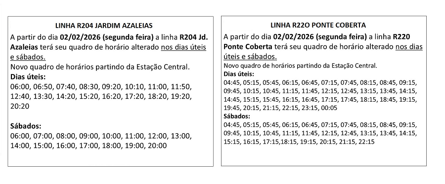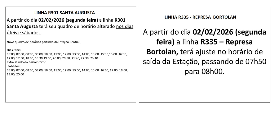 No bairro Santa Augusta haverá mudança de horário nos dias úteis e sábado na linha R301. E na zona oeste, a linha R335 – Represa Bortolan terá mudança no horário de saída da Estação, passando de 7h50 para às 8h da manhã no dia 2 de fevereiro.
