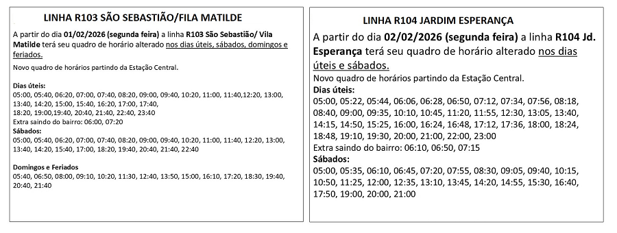 Ainda na zona sul da cidade a partir do dia 1º de fevereiro haverá mudança de horários na linha R103 São Sebastião/Vila Matilde nos dias úteis, fim de semana e feriados. A linha R104 Jardim Esperança terá alteração de horário nos dias uteis e nos sábados, a partir do dia 2.