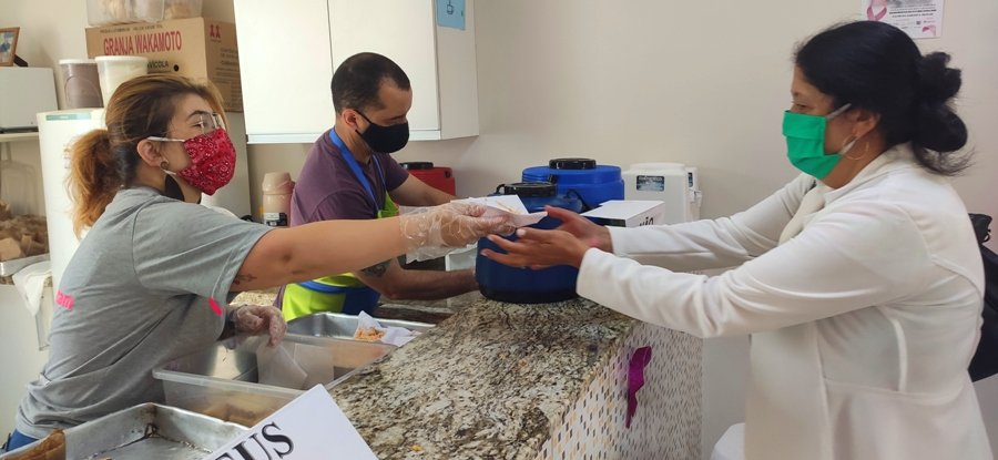 Desde o início da pandemia de covid-19, a Associação Lenços ao Vento tem feito diariamente o trabalho voluntário de distribuição do café da manhã no Café Cacon da Santa Casa.
