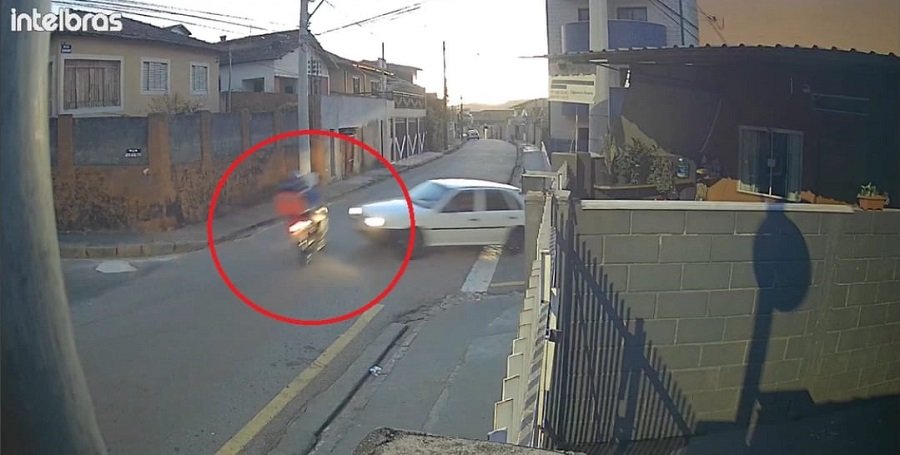 No local, o condutor de uma motocicleta relatou que trafegava com sua esposa como passageira quando um veículo VW Gol branco avançou a sinalização de parada obrigatória e colidiu com a lateral da moto.