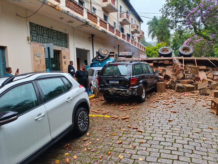 O caminhão bateu em uma palmeira imperial, tombou e atingiu três veículos que estavam estacionados na rua. Com o impacto a carga se espalhou pela via.