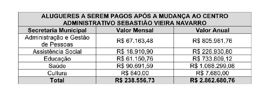 A Secretaria de Administração listou os gastos atuais com aluguéis por secretaria, totalizando R$ 2.862.680,76.